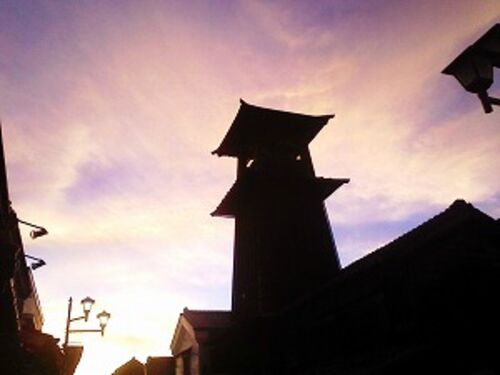 こんにちは! 16日の夕方。台風一過の夕焼け空です☆ 逆光で 時の鐘のシルエットがくっきり!紫色の神秘的な空でした(^_^)お彼岸も近付き 日暮れも早くなってきましたね!3時の時の鐘を聞きいて いも恋を食べながら 散策も いいですよ〜♪ どんな色の夕焼けに…